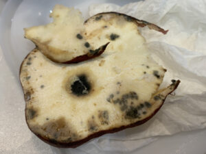 フードプロセッサーで野菜クズを細かく刻もうと思った時に気づきました。カビが生えたサツマイモが生ゴミの中に混じっている事に。おお~、普段見かけない光景です。と言うのは、我が家の冷蔵庫内ではカビが生えている食材を殆ど見ません。でもこの芋、確か僕がスーパーで選んだデカい芋だ!そして甘くなくて食べるのに困っていたヤツなんです。半分に切って食べて、最近その残りを食べたって事なんですね~。でも切った断面って冷蔵庫内でも簡単にカビが生えるのか!と学びました。皮の方はカビないのに、切った断面はカビやすいんかな~。面白い。